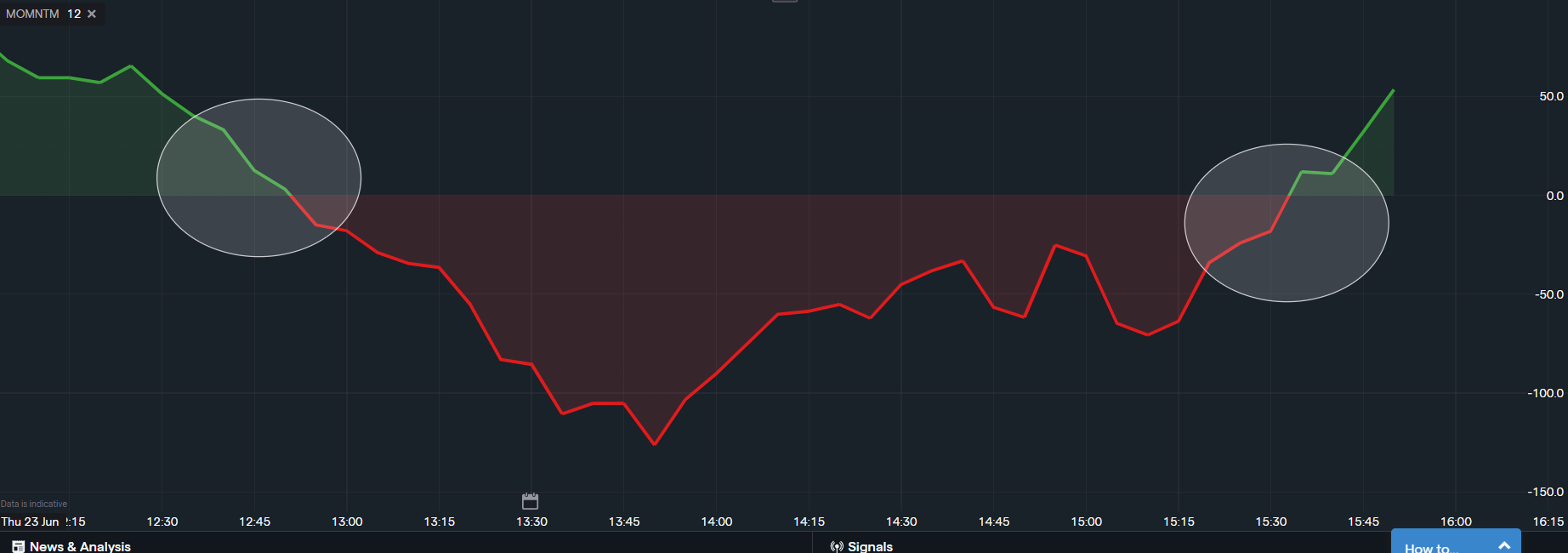 Suppose your time frame is 5 minutes and in these 5 minutes the momentum goes from negative to positive then it meets the conditions that the momentum crosses the zero line (from bottom to top) and this whole 5 minute line will turn green.