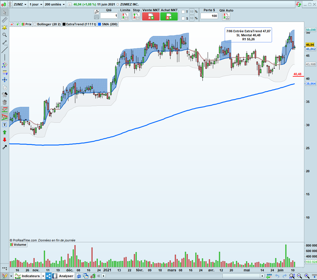 // objectif : recherche un point d'entrée avec SL court dans une tendance haussière sur un titre liquide.