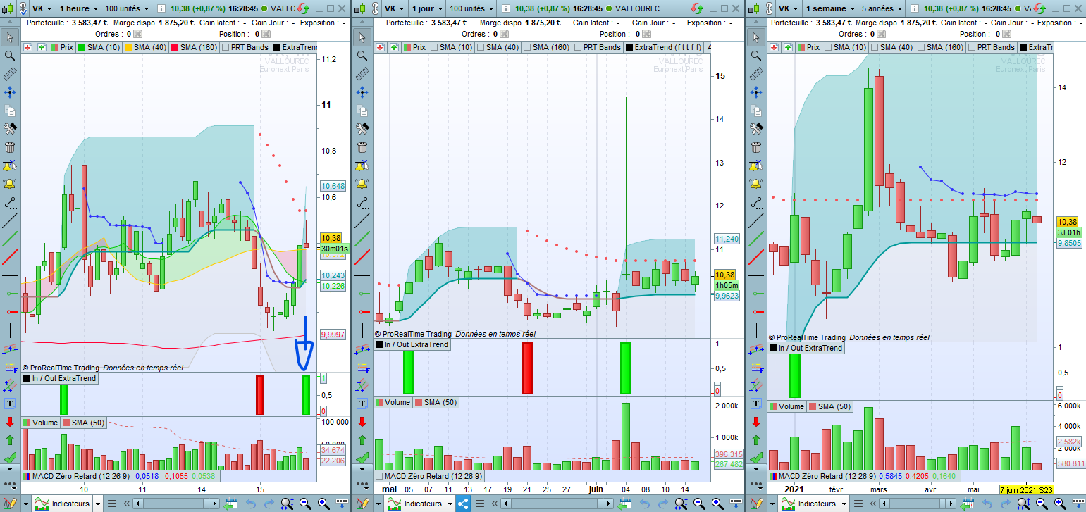 j’aime bien travailler avec une vision multi-UT. Le screener que je partage ici indique indique le démarrage d’une tendance haussière dans une unité courte (1 heure) sur des valeurs qui sont déjà en trend haussier sur les unités de temps supérieur (jour et semaine). Il a donc pour objet de proposer des points d’entrée à la hausse sur des tendances établies, avec un SL très court. Comme indiqué par la flèche bleue sur la capture.