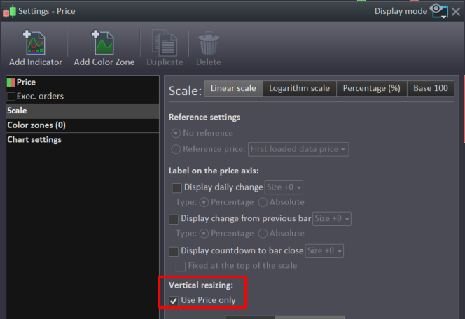 Pour éviter une mise à l’échelle “aplatit” à cause d’une valeur hors échelle, il faut configurer l’échelle du graphique du prix pour utiliser “le prix seulement”.