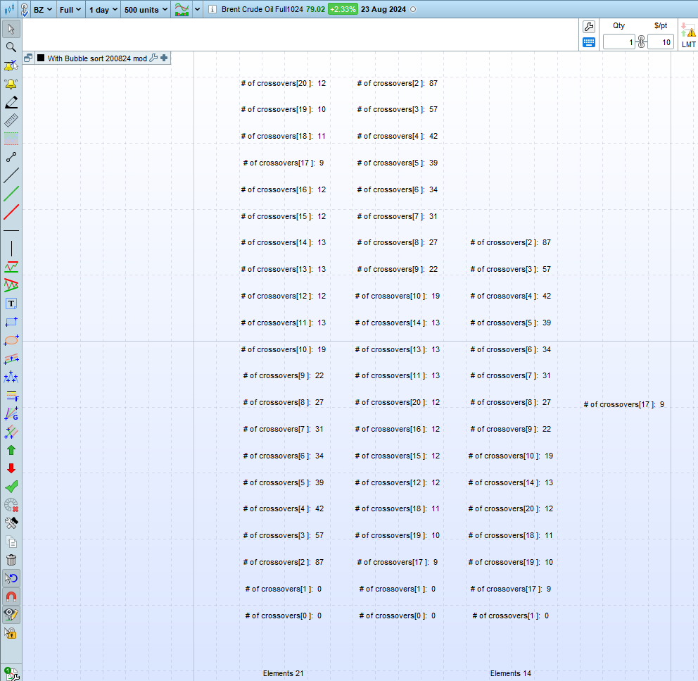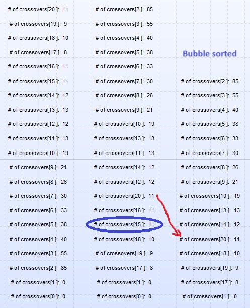 With the bubble sort result, if you have a look at the numbers in the brackets [x], these are the periods that the moving average crossovers were recorded in.
