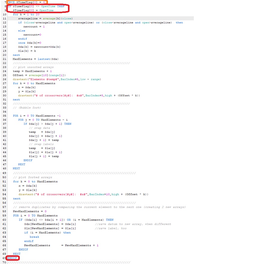 I have added a new 1-element array to be used as a flag to detect any change in the opening time of a bar, so we can tell when a new bar has formed to update the array (lines 7, 8 and 9). The IF in line 8 is closesd in line 69.