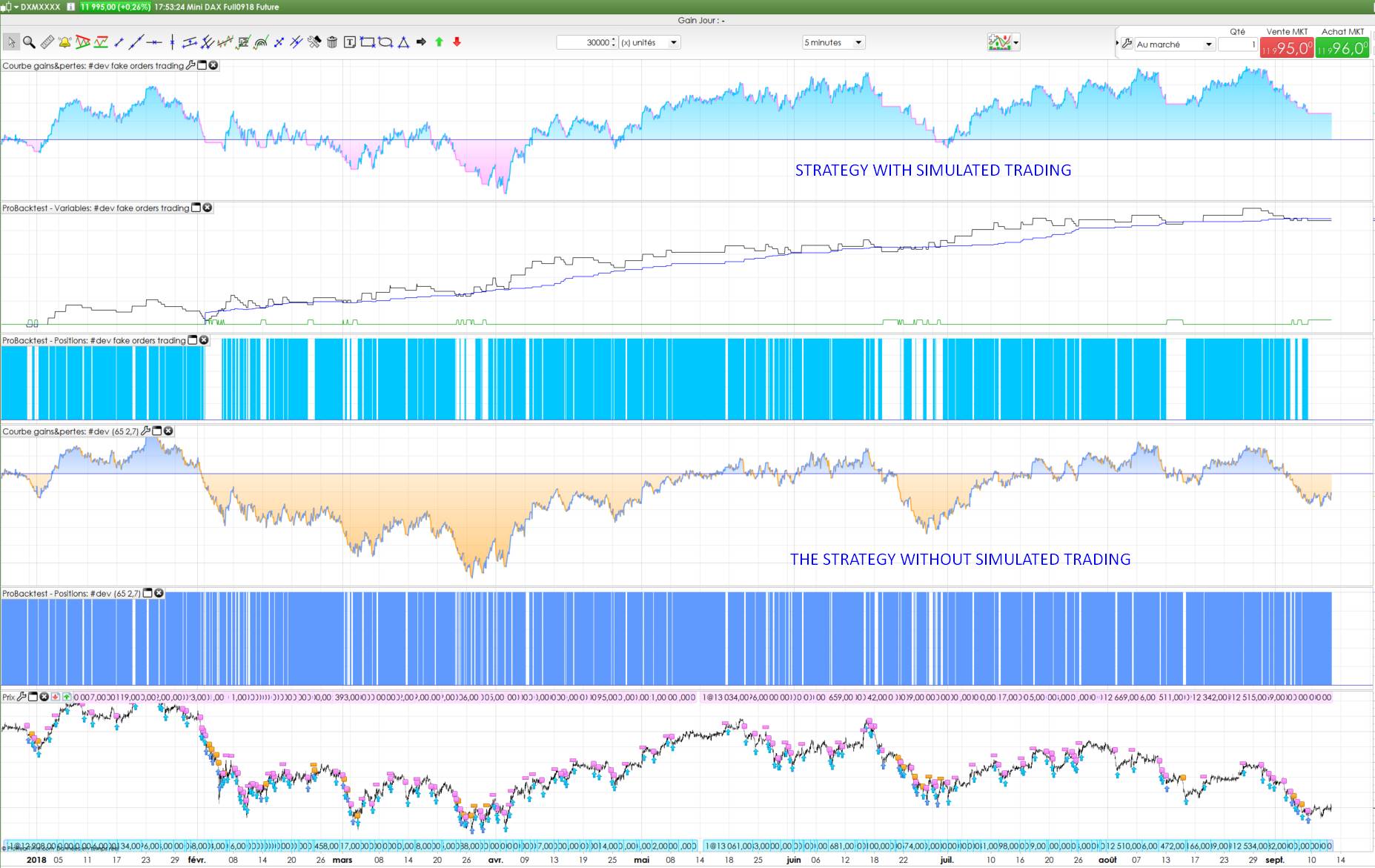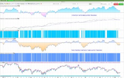 The results are encouraging, the strategy stops trading during bad times, compare the 2 equities curves, below is the basic strategy, above the strategy with the simulated orders: