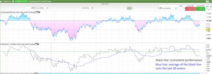 The false orders are represented by the green line at the bottom of the graph, we note the performances that accumulates well on the black curve (and on the average in blue), while there is no order really at the market!