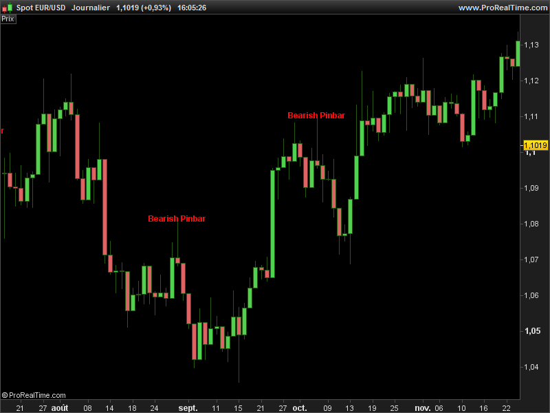 Find and display “Bearish Pinbar” on chart with the DRAWTEXT instruction.