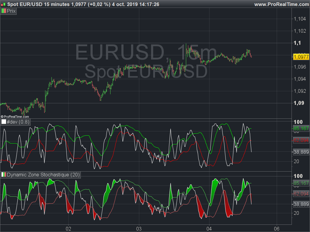 DYNAMIC ZONE STOCHASTIC The “Dynamic Zone Stochastic” is an oscillator from 0 to 100 that indicates zones where the security is “overbought” or “oversold”. Unlike the classical Stochastic, the zones where the security is “overbought” or “oversold” are dynamic rather than fixed. Interpretation: