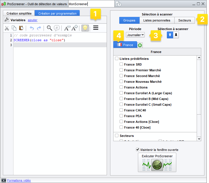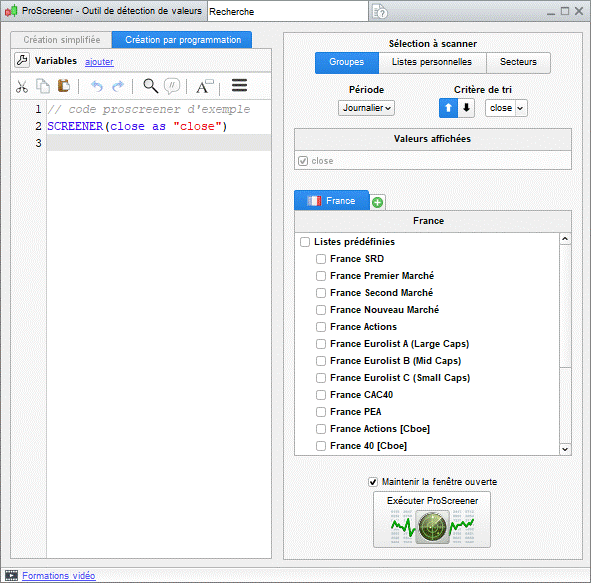• Assisted programming”, which lets you define search criterion conditions without programming (to learn more about this feature, we recommend watching the video, “Creating a ProScreener without writing a line of code“).