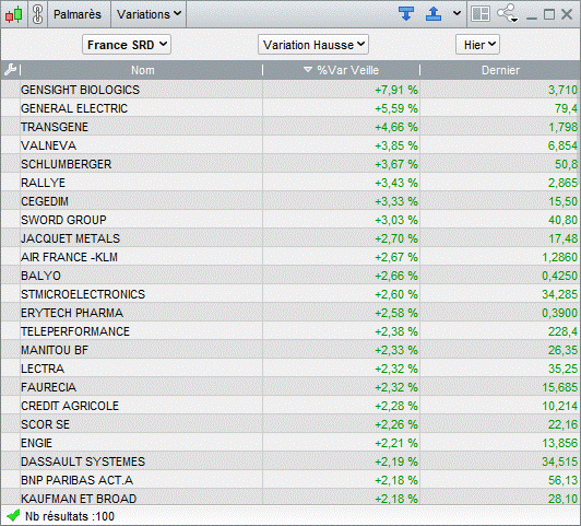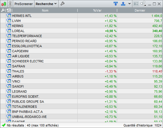 In addition to the ProScreener, ProRealTime offers you the Palmares window. Palmares are real-time scan windows with predefined criteria (unlike ProScreener, which is fully customizable). They enable you to carry out simultaneous searches (e.g.: upward variation in one window, downward variations in the other).