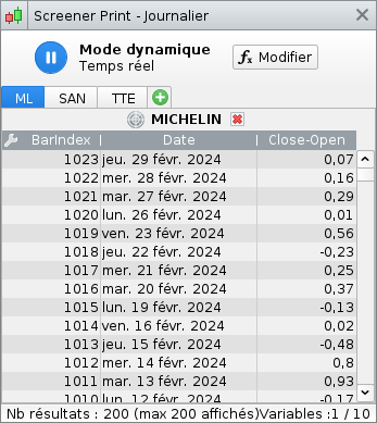 Let’s suppose we want to find all SRD France stocks whose current bar (period) opening is higher than the previous bar closing. We write :