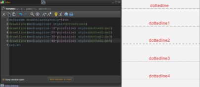 defparam drawonlastbaronly=true drawhline(medianprice) style(dottedline1) drawhline(medianprice-10*pointsize) style(dottedline1) drawhline(medianprice-20*pointsize) style(dottedline2) drawhline(medianprice-30*pointsize) style(dottedline3) drawhline(medianprice-40*pointsize) style(dottedline4) return |