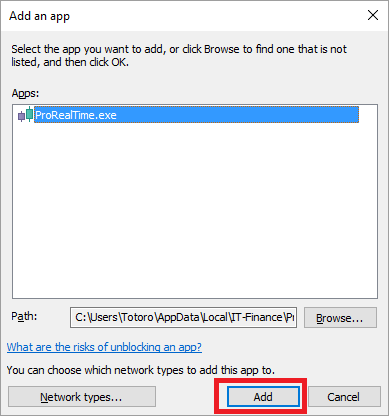 • Find the line that was added (either “ProRealTime.exe” or “ProRealTimeTrading.exe” or “IGProRealTime.exe”) and check the 2 boxes.