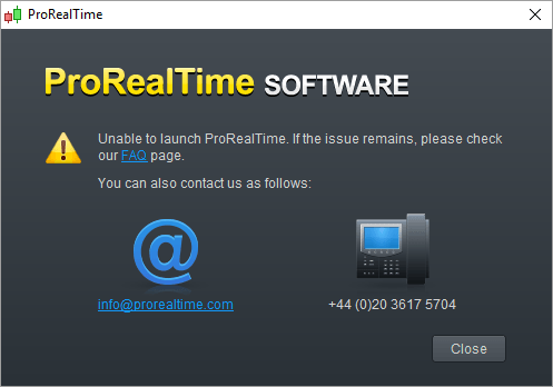 Important: ProRealTime provides an online FAQ that will solve most of your launching issues in just a few minutes. This article is only intended for people who have already followed the steps of ProRealTime’s online FAQ and were still not able to solve their launching issue. As a result, the article provides very detailed steps that may not be necessary to solve most issues.