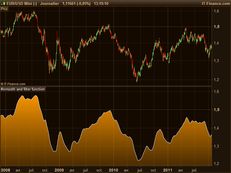This article deals with some functions that be can used to filter signals of any kind. Each individual code snippet present in this blog post would operate as data smoothing or filtering in your own indicators or automated strategies development.Each function need its “Data” variable to be populate with with your own variable value. In these examples, the Close value is used. Please feel free to use them for any purpose!