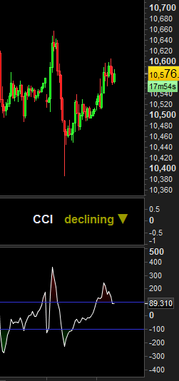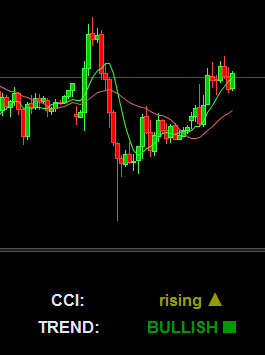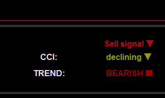 Let’s take the Commodity Channel Index (CCI) indicator and retrieve its overbought and oversold informations. If the oscillator is above 100, it’s overbought, under -100 = oversold, otherwise we only test if it is declining or rising and write it up on screen: