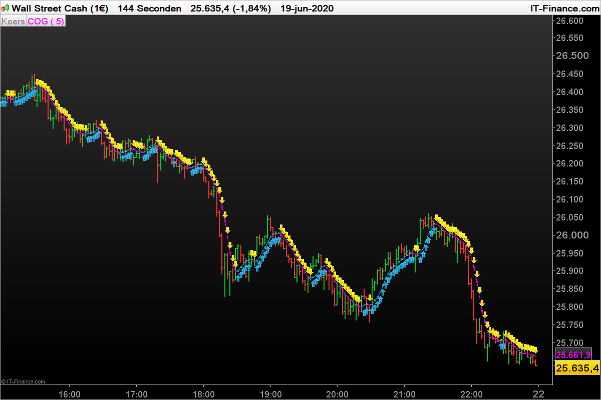 // settings n = 20 // --- HL=(high+low)/2 Sum=(summation[n](HL))/n cog=TriangularAverage[2](sum) if cog > cog[1] then DRAWARROWUP(barindex, cog-0.25*AverageTrueRange[14](close))coloured(0,125,175,255) elsif cog < cog[1] then DRAWARROWDOWN(barindex, cog+0.25*AverageTrueRange[14](close))coloured(255,205,0,255) endif return cog |