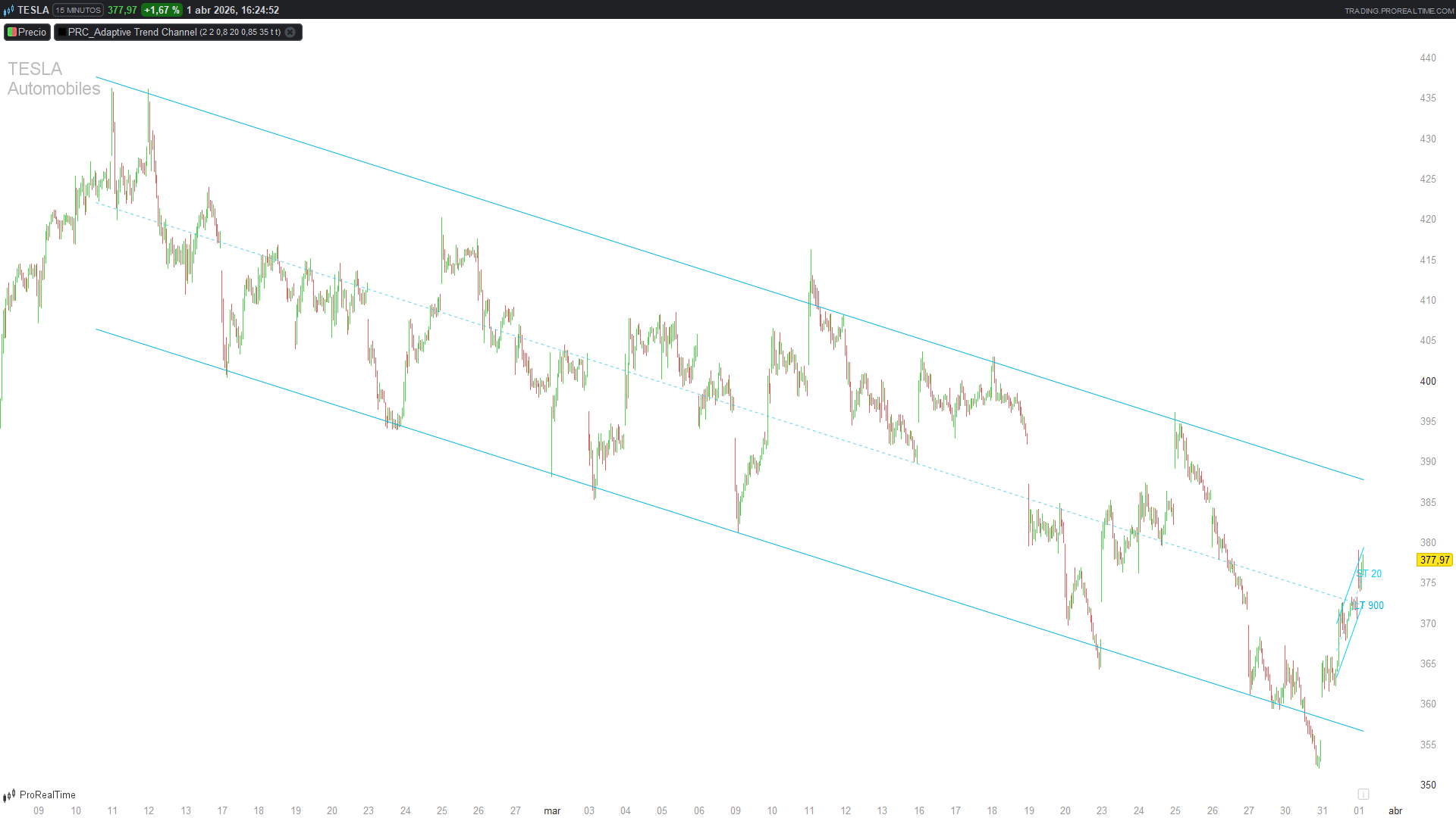 Originally developed for TradingView by Julien_Exe, this indicator has been adapted to ProBuilder for ProRealTime. It evaluates each candidate channel through a multi-factor scoring system — combining statistical fit, trend strength, containment quality, and stability — to find the most reliable trend channel at any given time.