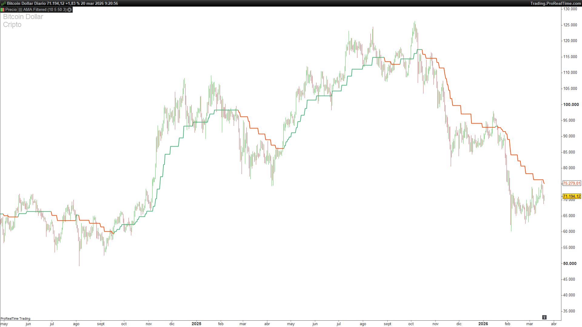 The result is a single colored line that stays remarkably still during noise and reacts quickly when a real trend develops.