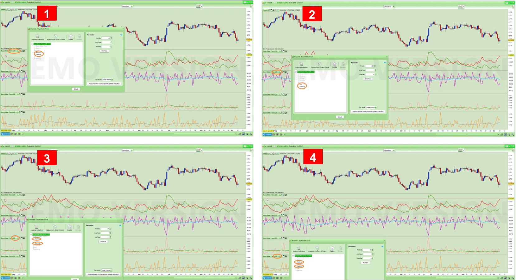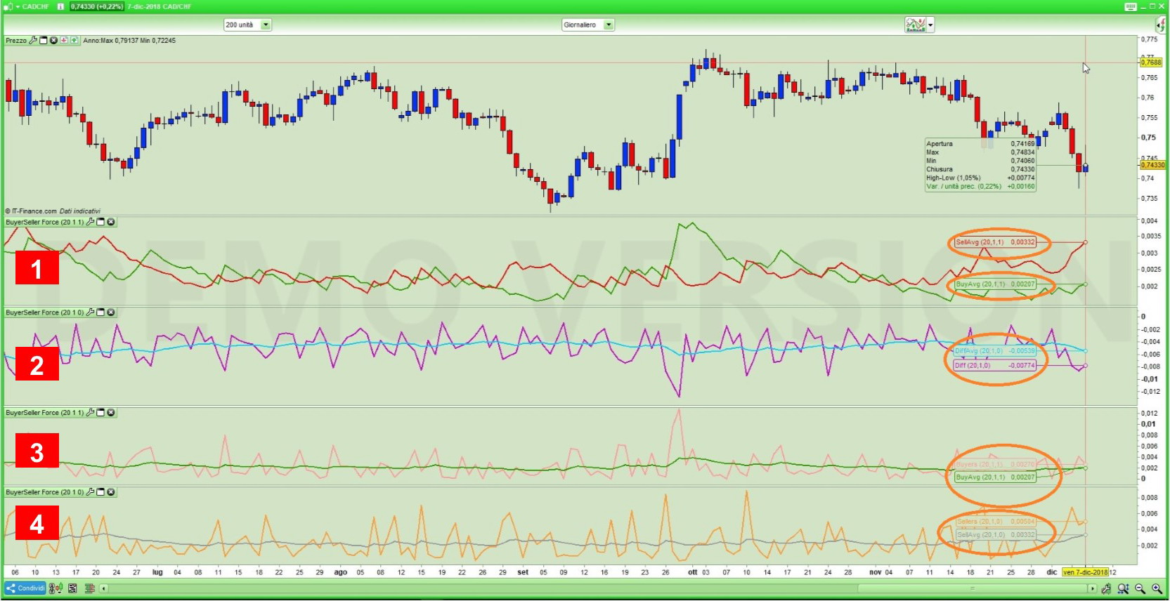 The FORCE of sellers can be measured by subtracting CLOSE from HIGH because they are pushing prices downwards, while that of buyers can be measured by subtracting CLOSE from LOW (or you can make it the other way round or use ABS()) as they push prices upwards.