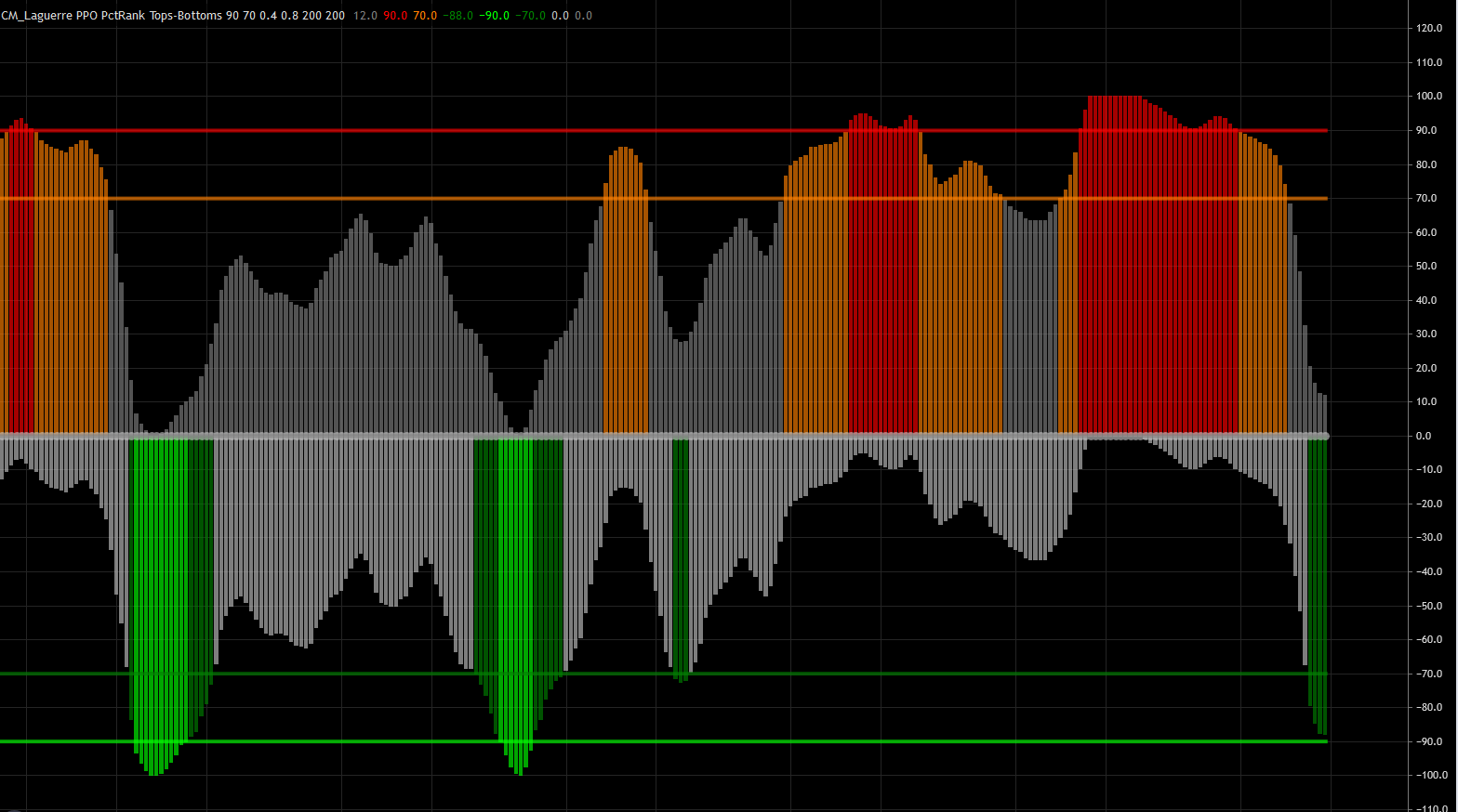 // CM_Laguerre PPO PctRank Tops-Bottoms // modificato CM_Laguerre PPO PercentileRank ora = tradingview // parameters : Short = 0.4 Long = 0.8 lkb = 200 //(Look back period) pctile = 90 //(Extreme threshold lines) midpctile = 70 //(Warning threshold lines) if(barindex>lkb) then hl2 = (high+low)/2 //laguerre short Ls0 = (1 - Short)*hl2+Short*(Ls0[1]) Ls1 = -Short*Ls0+(Ls0[1])+Short*(Ls1[1]) Ls2 = -Short*Ls1+(Ls1[1])+Short*(Ls2[1]) Ls3 = -Short*Ls2+(Ls2[1])+Short*(Ls3[1]) lmas = (Ls0 + 2*Ls1 + 2*Ls2 + Ls3)/6 //laguerre long Ll0 = (1 - Long)*hl2+Long*(Ll0[1]) Ll1 = -Long*Ll0+(Ll0[1])+Long*(Ll1[1]) Ll2 = -Long*Ll1+(Ll1[1])+Long*(Ll2[1]) Ll3 = -Long*Ll2+(Ll2[1])+Long*(Ll3[1]) lmal = (Ll0 + 2*Ll1 + 2*Ll2 + Ll3)/6 pctileB = pctile * -1 midpctileB = midpctile * -1 //PPO Plot ppoT = (lmas-lmal)/lmal*100 ppoB = (lmal-lmas)/lmal*100 //PercentRank of PPO // percent rank = nb of value less than our value / (nb of values less than our value + nb of values greater than our value) topvalueMinus = 0 topvaluePlus = 0 bottomvalueMinus = 0 bottomvaluePlus = 0 for i = 0 to lkb do if ppoT[i]<ppoT then topvalueMinus = topvalueMinus+1 else topvaluePlus = topvaluePlus+1 endif if ppoB[i]<ppoB then bottomvalueMinus = bottomvalueMinus+1 else bottomvaluePlus = bottomvaluePlus+1 endif next pctRankT = topvalueMinus / (topvalueMinus+topvaluePlus) pctRankB = (bottomvalueMinus / (bottomvalueMinus+bottomvaluePlus)) *-1 //coloring histogram TOP ROSSO if pctRankT>=pctile/100 then TopColor = 1 else TopColor = -1 endif //coloring histogram MID TOP ARANCIONE if pctRankT>=midpctile/100 and pctRankT < pctile/100 then TopColor = 2 endif if TopColor=1 then r=255 g=0 b=0 elsif TopColor<0 then r=128 g=128 b=128 Endif if TopColor=2 then r=255 g=140 b=0 elsif TopColor<0 then r=128 g=128 b=128 Endif //coloring histogram BOTTOM VERDE CHIARO if pctRankB <= pctileB/100 then BottomColor = 1 else BottomColor = -1 endif //coloring histogram MID BOTTOM VERDE SCURO if pctRankB <= midpctileB/100 and pctRankB > pctileB/100 then BottomColor = 3 endif if BottomColor = 1 then rr=255 gg=0 bb=255 elsif BottomColor < 0 then rr=211 gg=211 bb=211 Endif if BottomColor=3 then rr=0 gg=128 bb=0 elsif BottomColor>0 then rr=0 gg=255 bb=0 Endif endif RETURN pctRankT coloured(r,g,b) as "Top", pctRankB coloured(rr,gg,bb) as "Bottom", 0 coloured (105,105,105) as "zero line", pctile/100 coloured (255,0,0) as "Top Percentile Threshold", pctileB/100 coloured (0,128,0) as "Bottom Percentile Threshold", midpctile/100 coloured (255,140,0) as "Warning Top Percentile Threshold", (midpctile*-1)/100 coloured (0,255,0) as "Warning Bottom Percentile Threshold" |