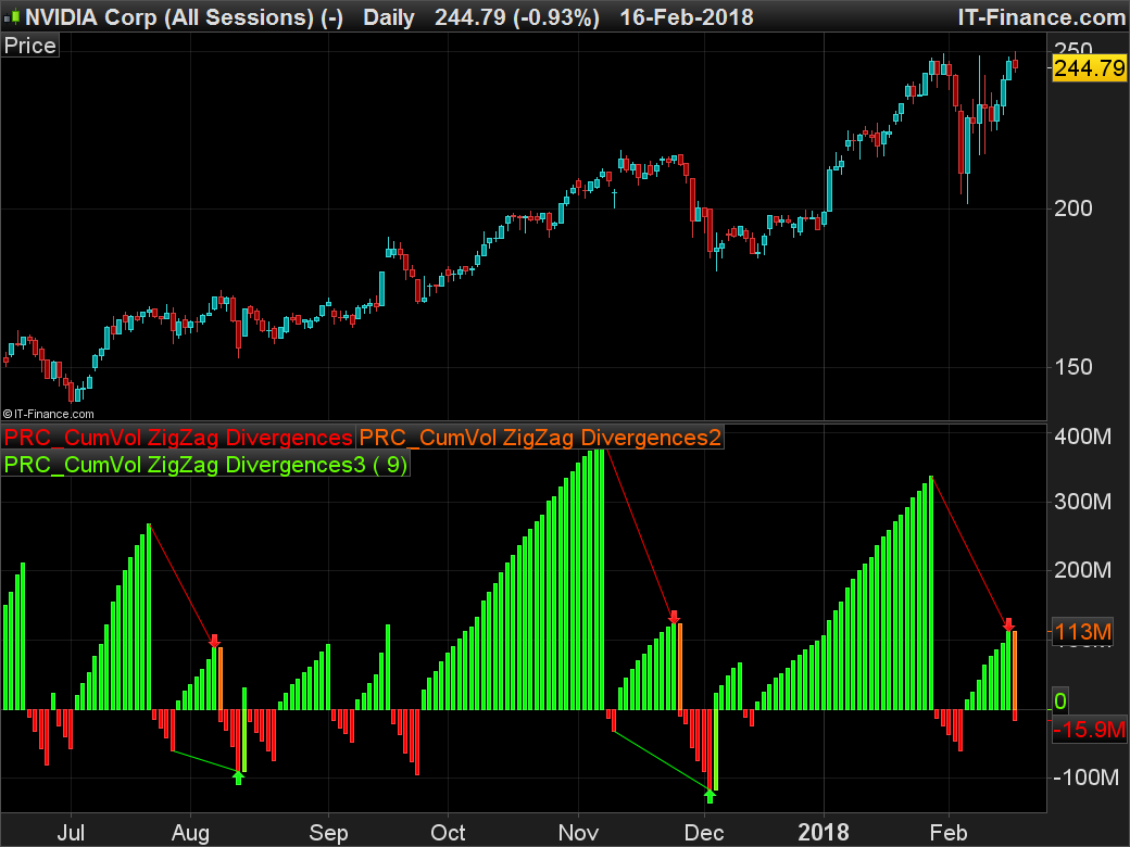 Original idea of this indicator came from this French topic: Cumulative Volume Zig Zag – Divergences