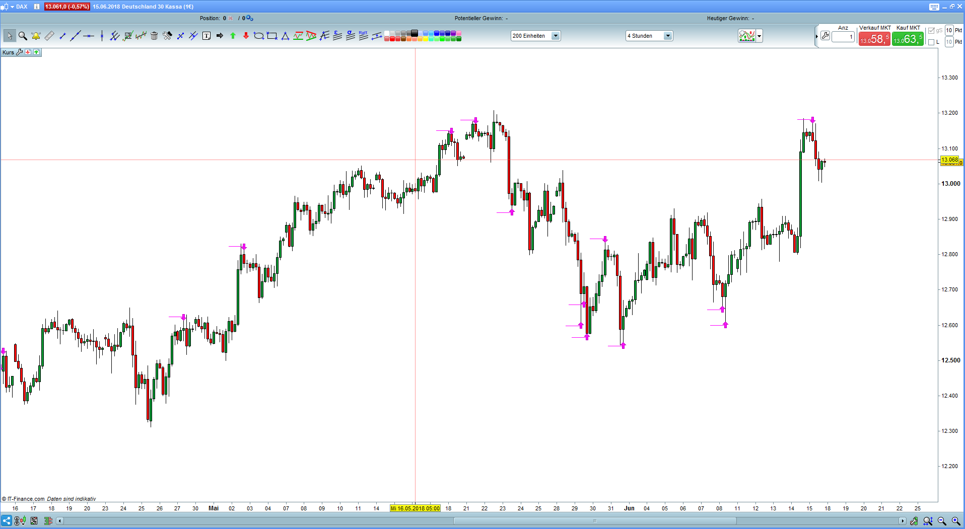and then I adapted the DeMarker “OnChart” in this way, you can see possible entry points for short and long positions in the Dax 4H as a reverse signal at extreme points.