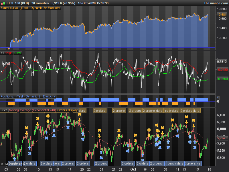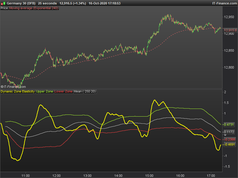 Dynamic Zone Elasticity indicator is an oscillator to predict short term direction. It is best used for scalping or automated trading. It comprises a signal line and dynamic lower and upper zones, as well as a mid-level.