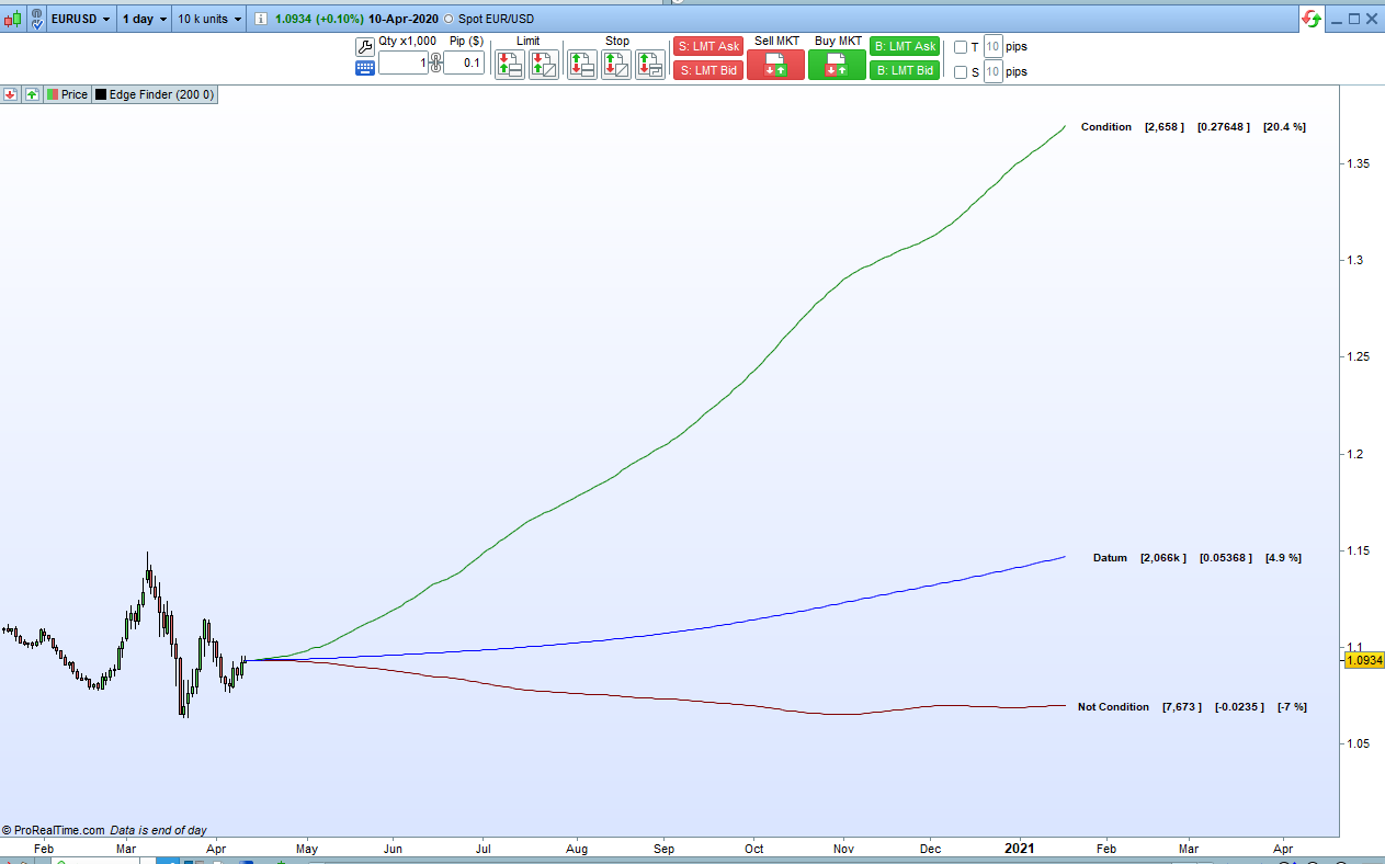 The blue line is our datum and is a line calculated from what happened after every bar on the chart. If this line curves upwards then we are trading a market that has a long tendency. If it curves down then it has a short tendency. If it is fairly level then the market might be considered to be more of a mean reversal market.