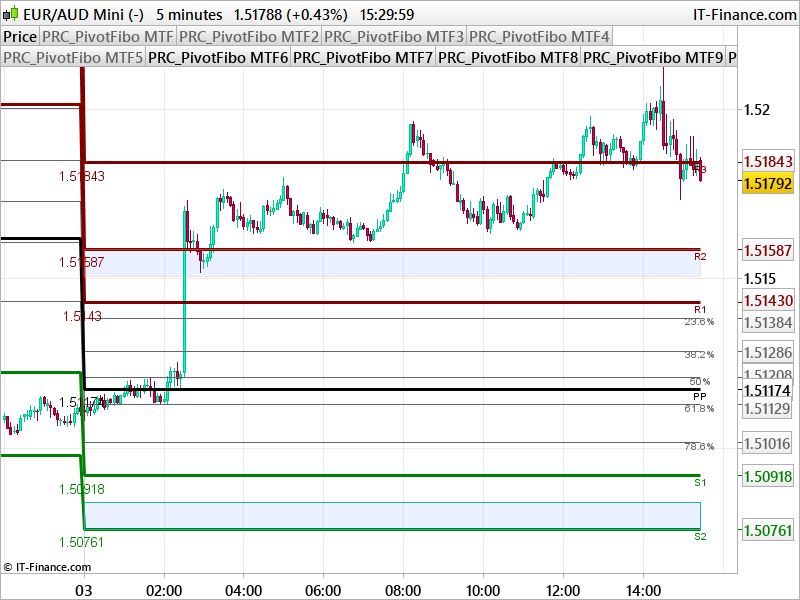 This pivots points indicator display also Fibonacci retracement numbers from previous period.