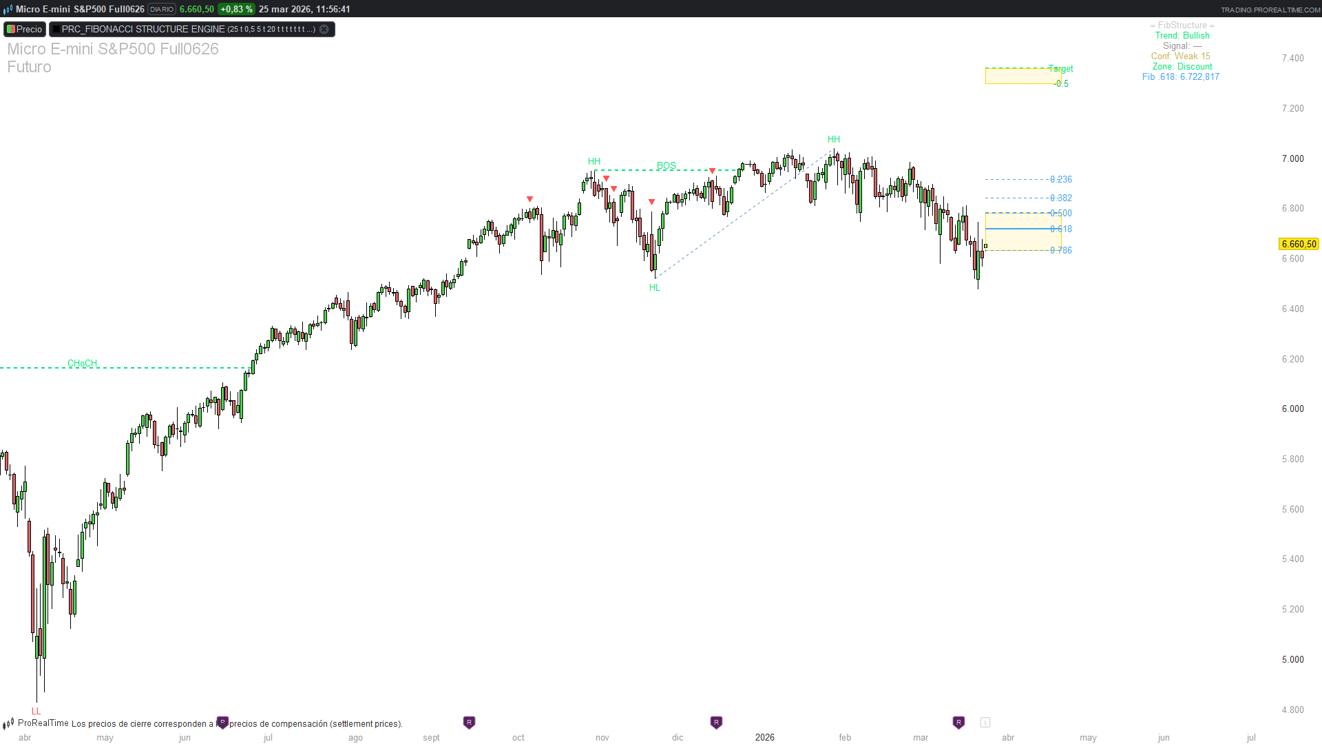 The Fibonacci Structure Engine is an overlay indicator that identifies market structure in real time. It detects swing highs and lows filtered by ATR to reduce noise, classifies them as HH (Higher High), HL (Higher Low), LH (Lower High) or LL (Lower Low), and identifies structural breaks: BOS (Break of Structure) when the trend continues, and CHoCH (Change of Character) when the trend reverses.