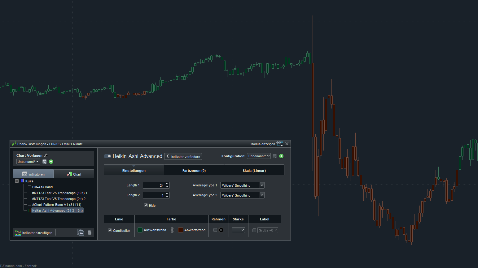 It is a smoothed Heikin-Ashi with possibility to hide Heikin-Ashi and only color the “normal” candles.
