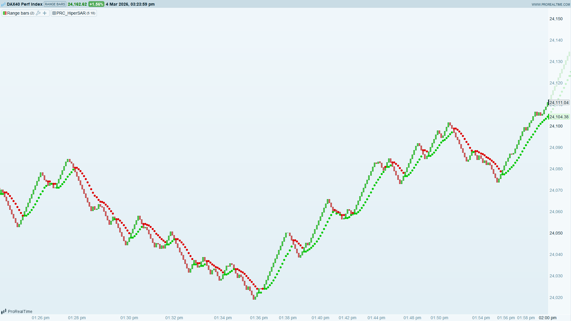 The indicator plots as two separate dot series directly on the price chart, green dots below price during uptrends and red dots above price during downtrends. A dot switching sides signals a potential trend reversal, same reading as the standard SAR but with entries and exits that are timed more closely to actual momentum shifts.