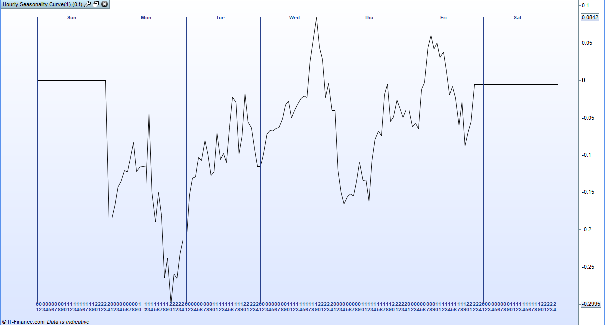 This indicator draws a seasonality curve for the week based on historical hourly price movements.