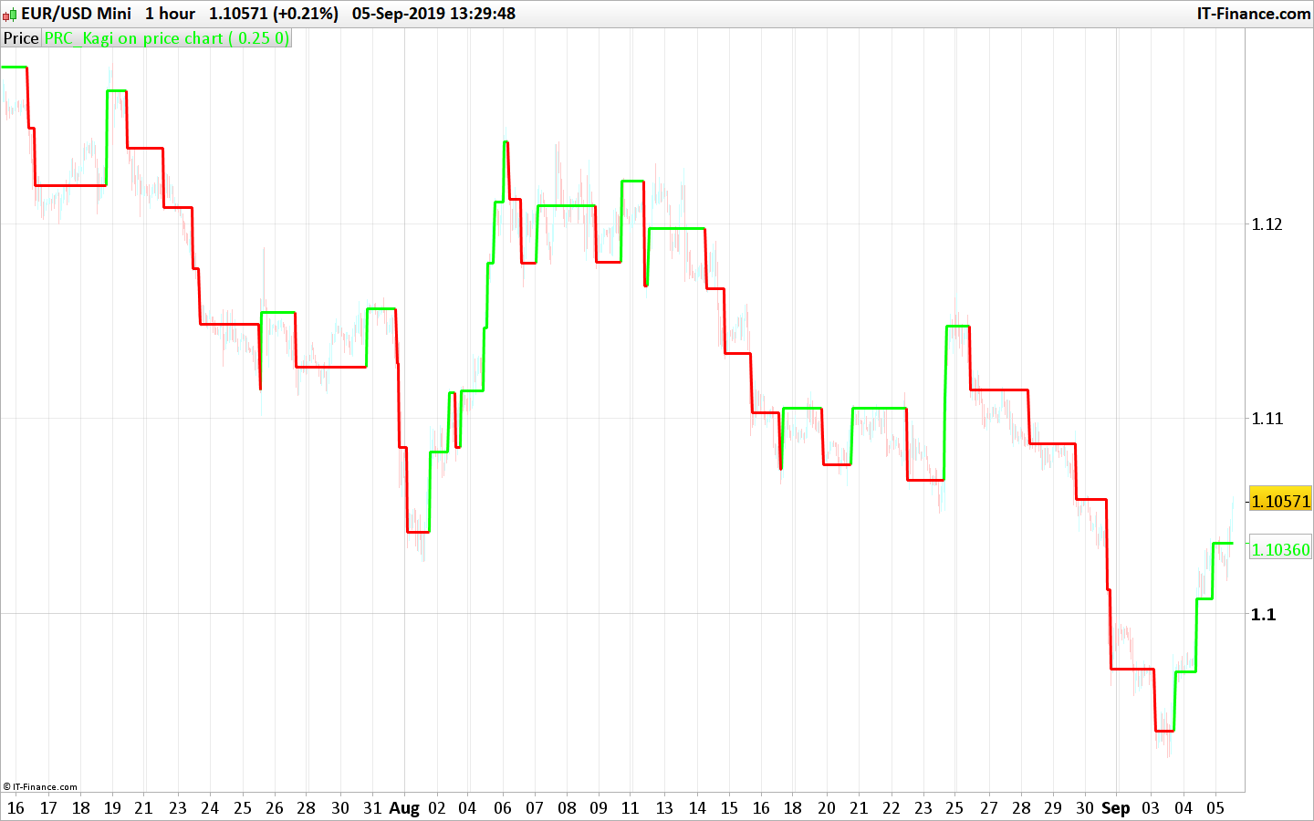 Kagi is a type of graphic representation that comes from Asia. This type of price chart is distinguished by the fact that one draws a Kagi type graph taking into account only the price. Indeed, even if time is represented on the abscissa axis, the time scale is not linear. This type of chart is convenient to follow the trend.
