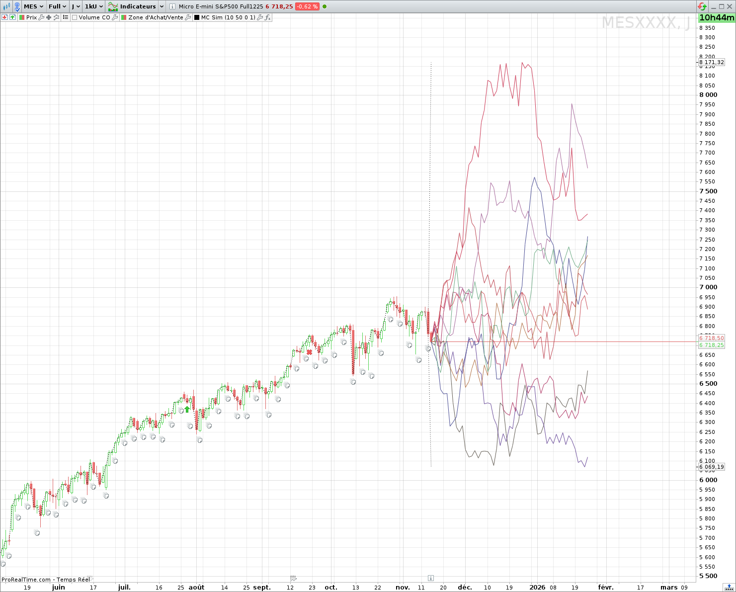 Because simulation runs on the last bar, paths emanate from “now” and do not clutter historical sections.
