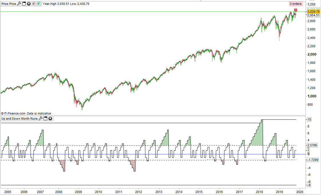 Knowing at a glance how many months up or down we have recently had compared to historical monthly bullish or bearish runs and comparing how far we are into a run compared to when a change of direction usually takes place can be useful information when taking an overview of current market conditions. This indicator allows us to see that information at a glance without needing to refer to a monthly chart.