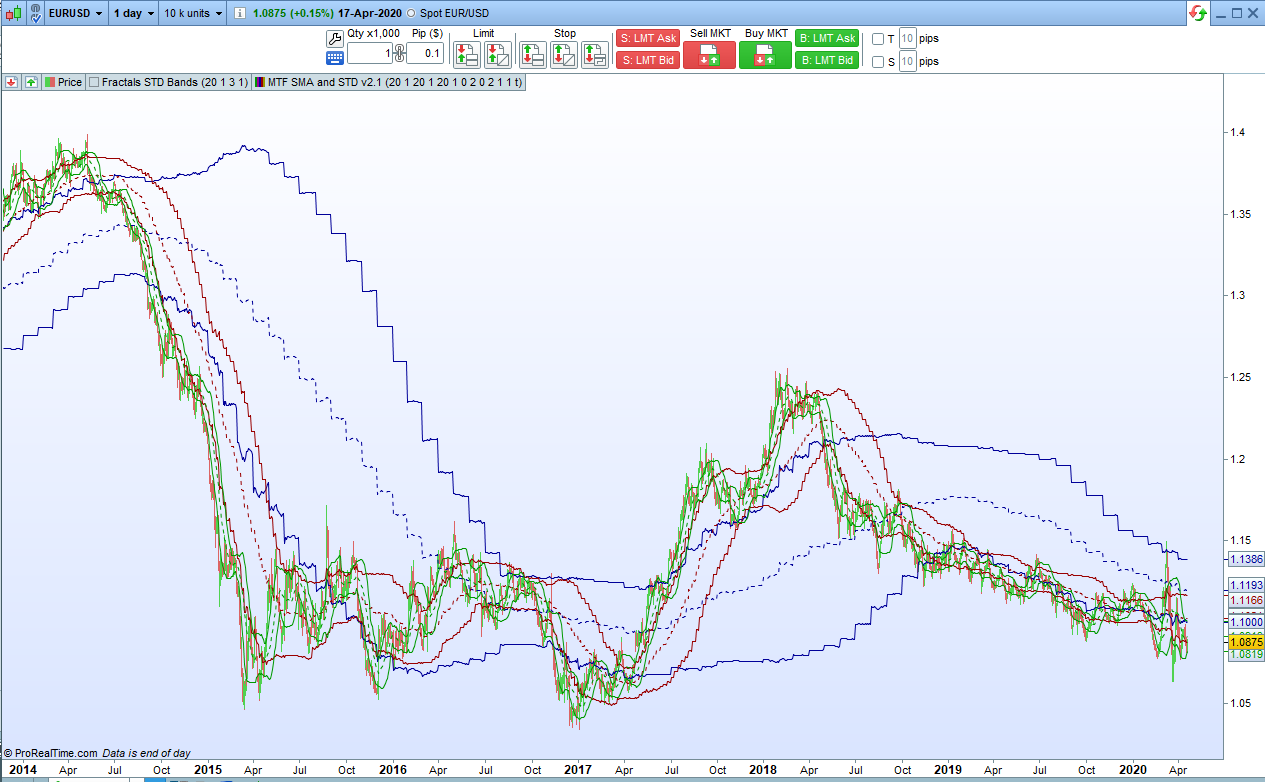 If putting Hourly or Minute lines on your chart then you also need to set HRQty and MIQty to the number of hours or minutes. So for example set HRQTY to 4 to display the simple moving average and standard deviation bands from the 4 hour chart. Set the p value of any line that you don’t want to draw to zero – this also helps the indicator calculate slightly quicker. For example if on a daily chart set HRp and MIp to zero.