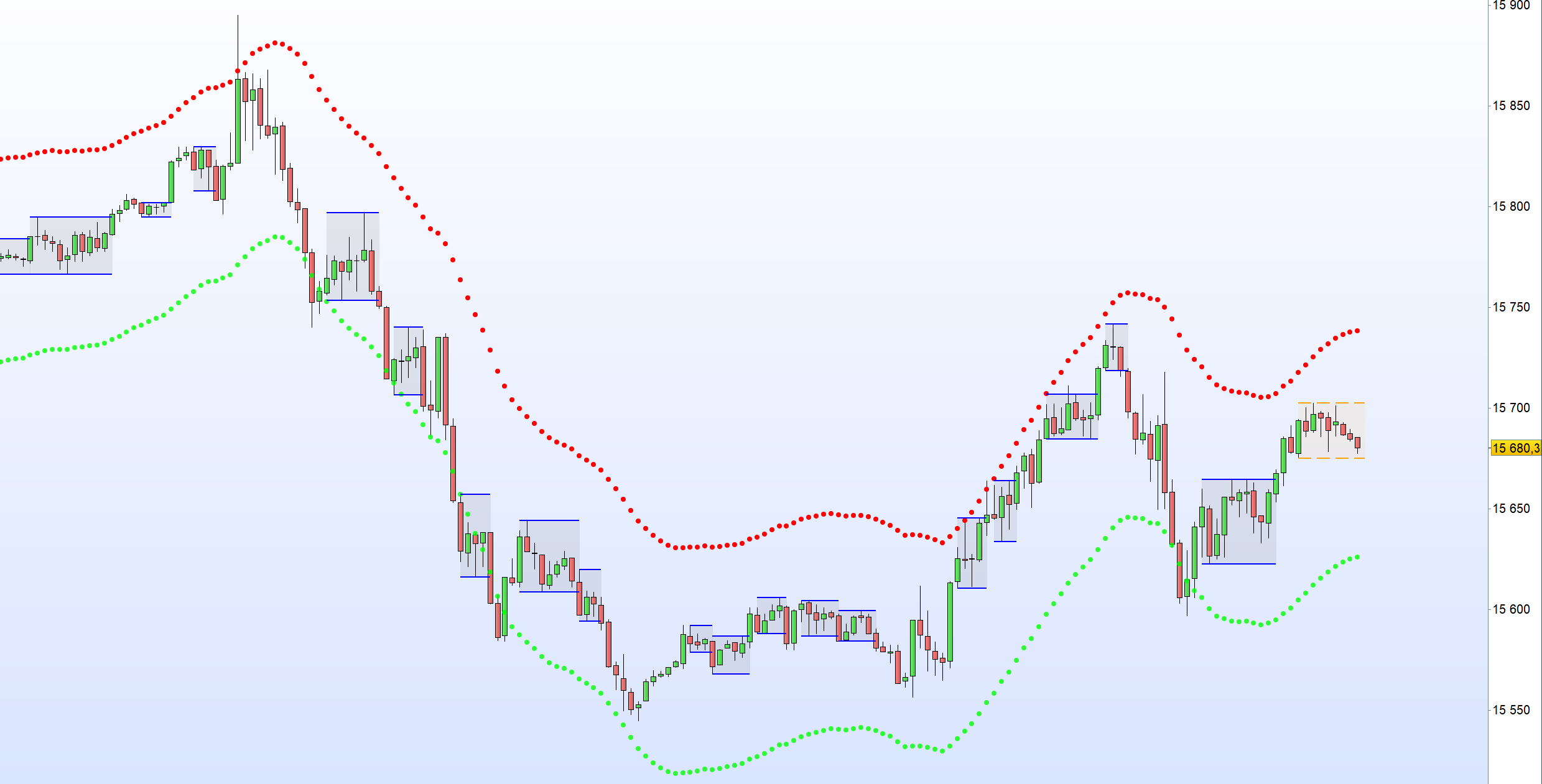 This tool can outline extremes made by the prices. This is achieved by estimating the underlying trend in the price, then calculating the mean absolute deviations from it, the obtained result is added/subtracted to the estimated underlying trend.