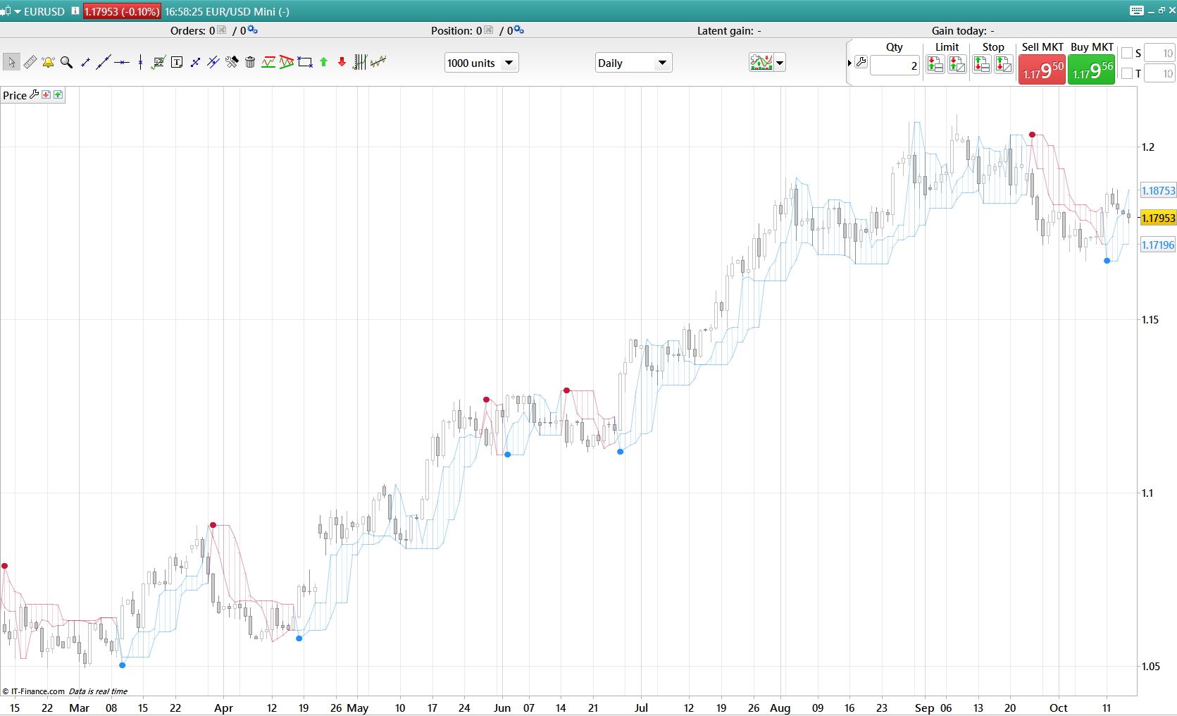 Confirmation of trend reversal are highlighted with blue and red dots.