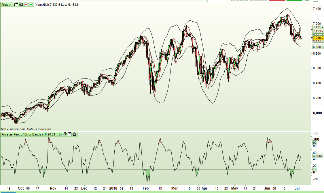 This indicator calculates standard error bands on price and then presents price as a percentage of the error band range. This makes it much easier to visualise where price is in the range by removing the contracting and expanding of the error bands.
