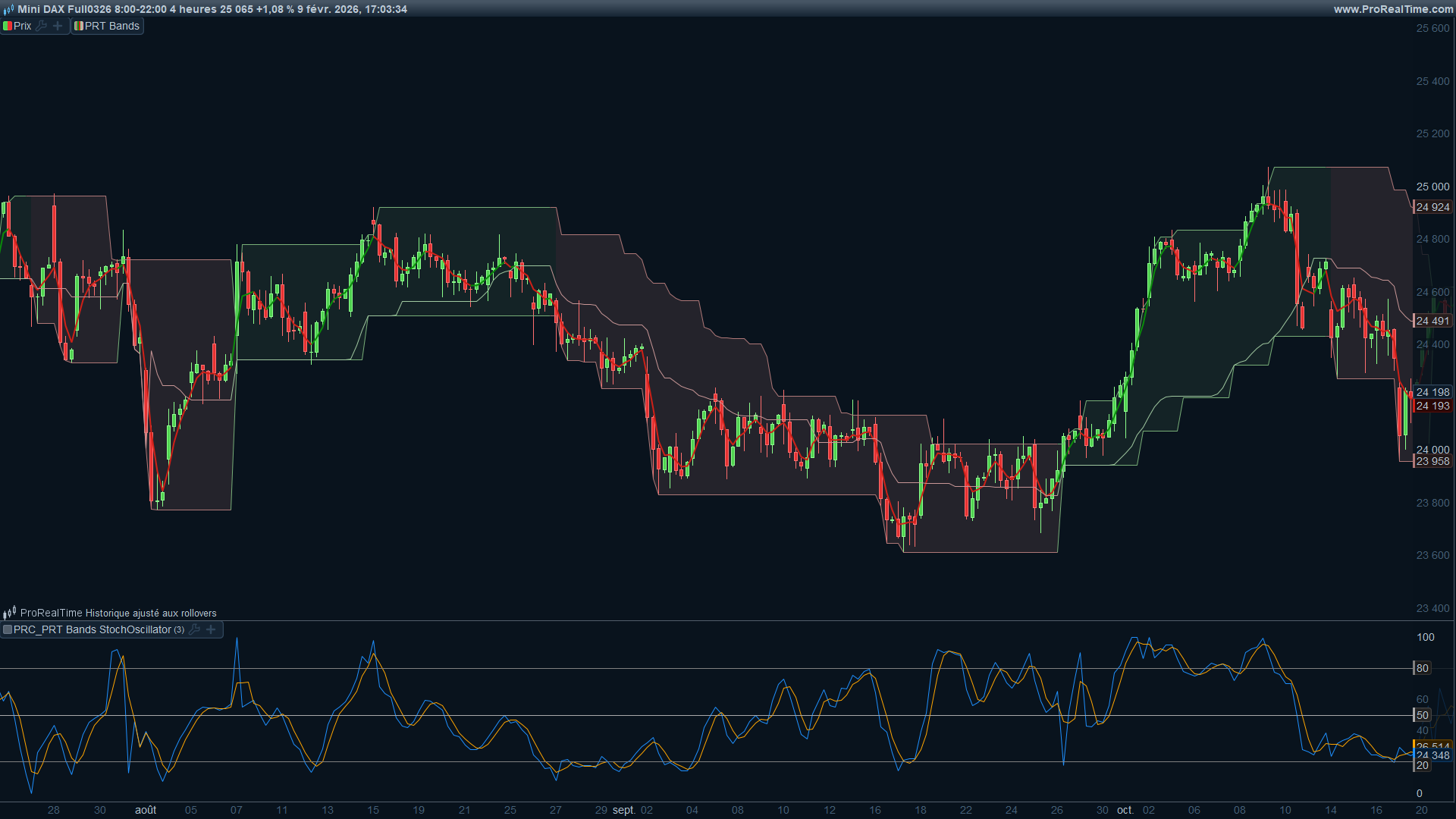 PRT Bands is a proprietary indicator built into ProRealTime. It consists of three components: