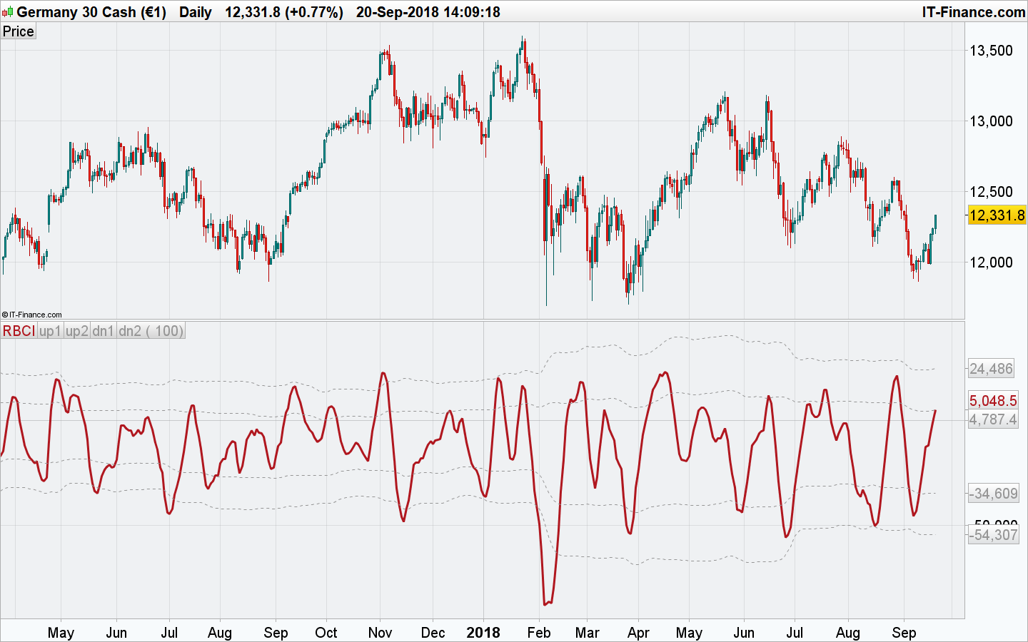 RETURN -RBCI coloured(176,23,31) style(line,3) as "RBCI", -up1 coloured(150,150,150) style(dottedline) as "up1", -up2 coloured(150,150,150) style(dottedline) as "up2", -dn1 coloured(150,150,150) style(dottedline) as "dn1", -dn2 coloured(150,150,150) style(dottedline) as "dn2"