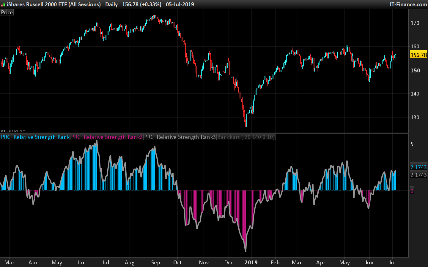 This indicator is a ranking tool used to compare a group of stocks, ETFs or futures contracts to determine which specific instrument is performing best. The indicator creates a score based upon the symbols historical price movement. You can then compare this score to the other RS Rank scores of other stocks or ETFs in your basket of trading instruments. Thus, you can simply pick the instrument with the highest RS Rank score when creating a momentum based trading system.