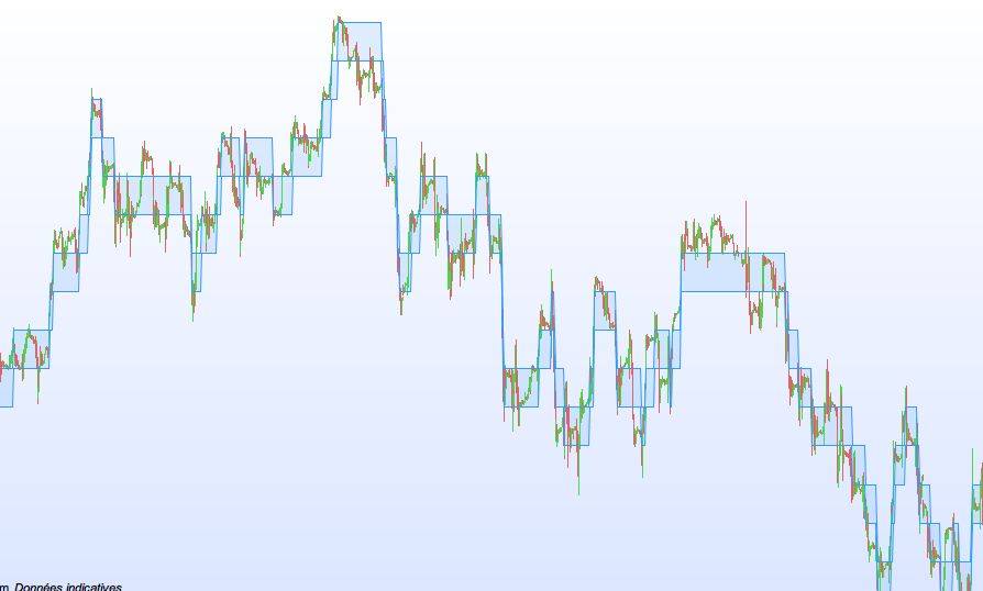 This indicator has fixed-size boxes, that’s the “why” of its name. Actually, he still uses the closing price. It would be perfect if it used the current price whatsoever at any time. But I do not see me using other than the command “close” to determine the price at a given time. For this graph and for example, I put this on the DAX, with fixed boxes of 100 points.