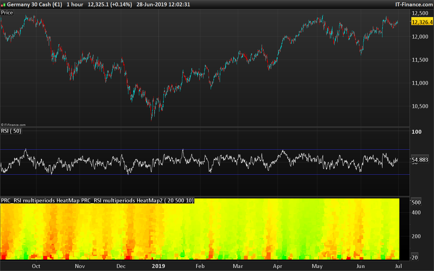 This “heatmap” type indicator plots the returned values of the RSI oscillator for all its calculated periods between the values of “StartPeriod” up to “MaxScale”. Each value is colored according to its degree of over-sold (in red) and over-bought (in green).