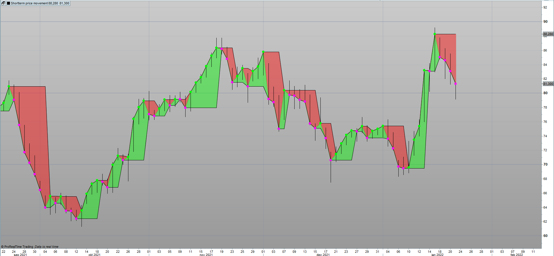 This indicator shows coloured areas of the price movement which gives a good picture of the shortterm trend