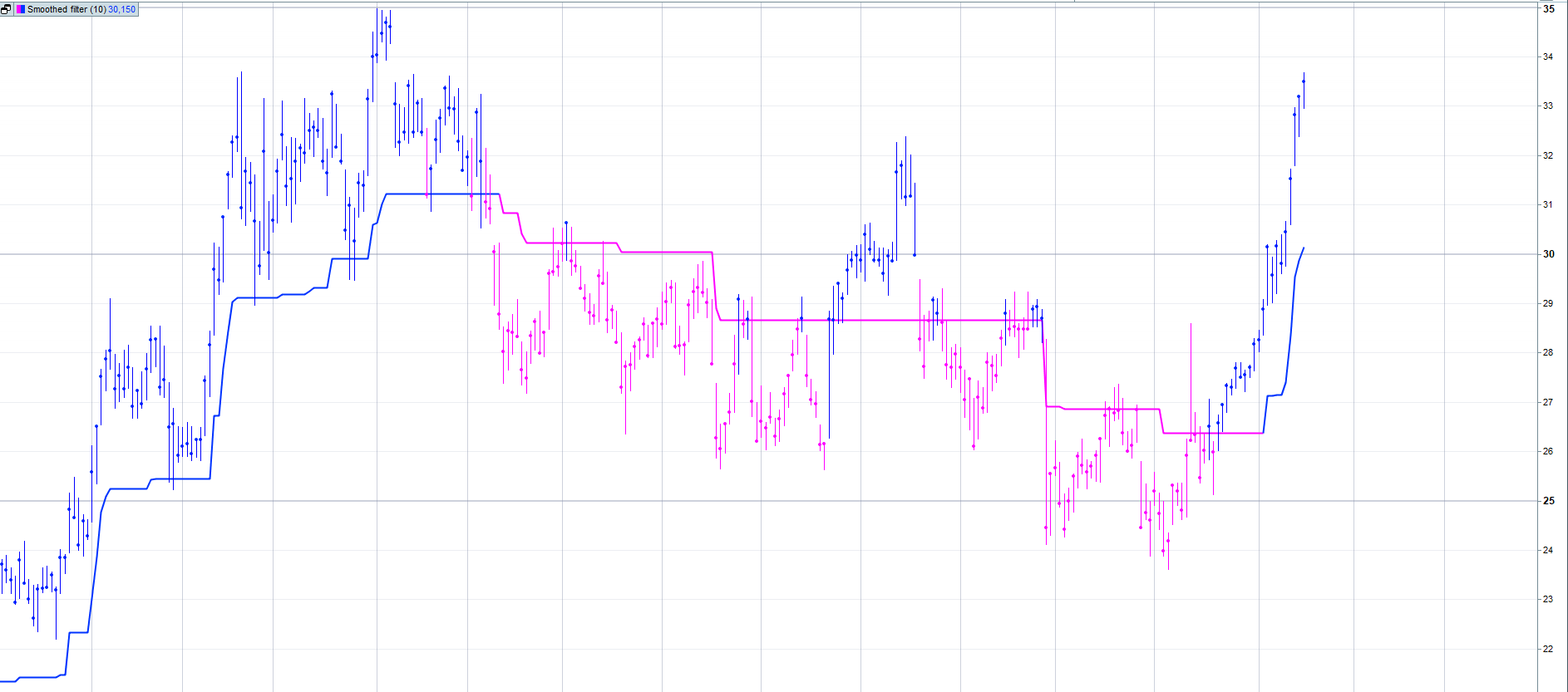 This indicator is based on adjustable artificial high and low values. The average filter regression is a kind of smoothed path between the price movements particular at higher percentages of high and low