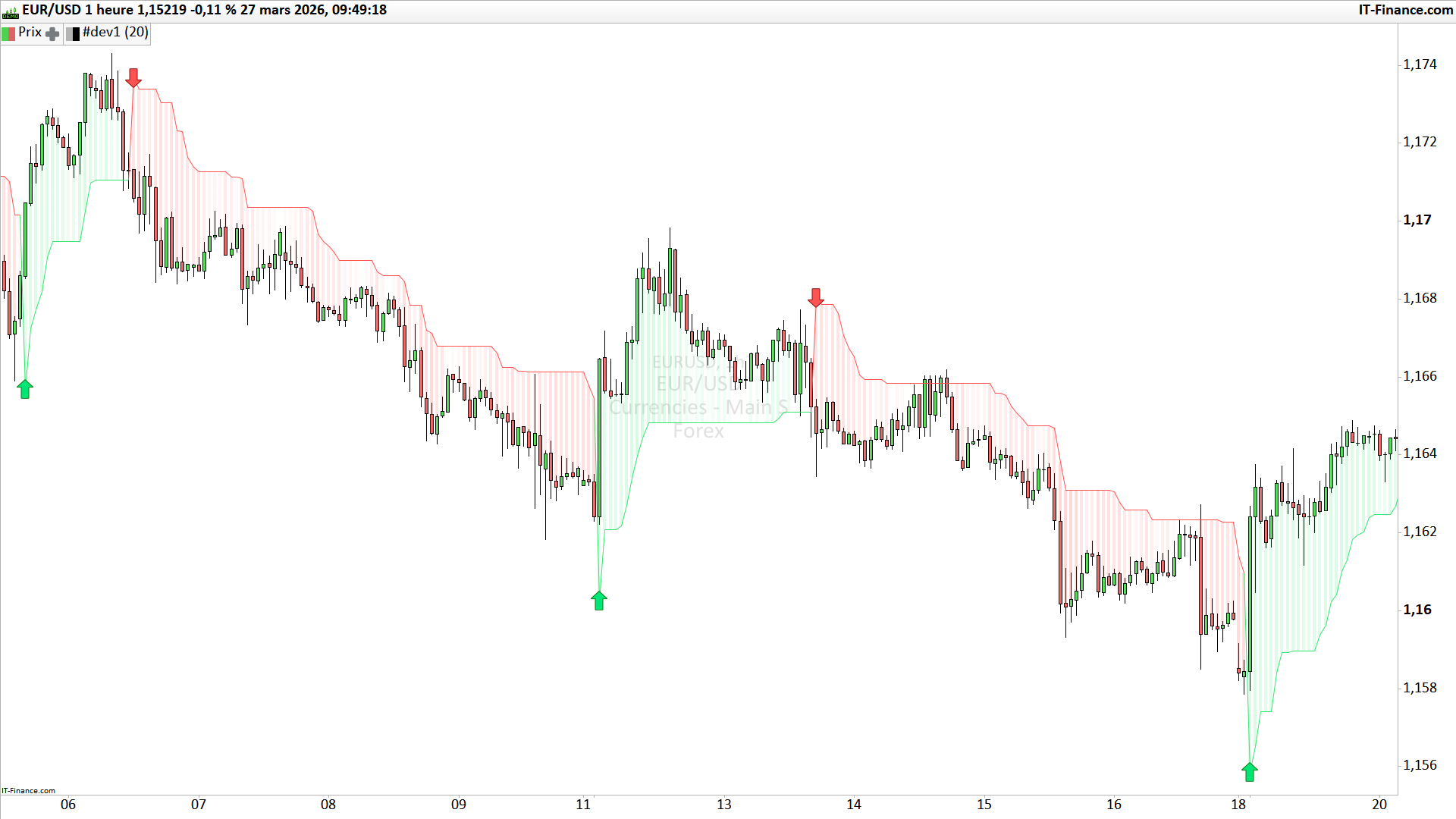 The indicator also computes a trend strength value from 0 to 100, combining two components: how far price has moved away from the SuperTrend band relative to ATR, and how strongly RSI is aligned with the current direction. This strength value is used to modulate the opacity of the band visualization, so a strong confirmed trend appears vivid and a weak or recently flipped trend appears more faded. Buy and sell signals are marked with arrows at the band level at the moment of the confirmed flip.