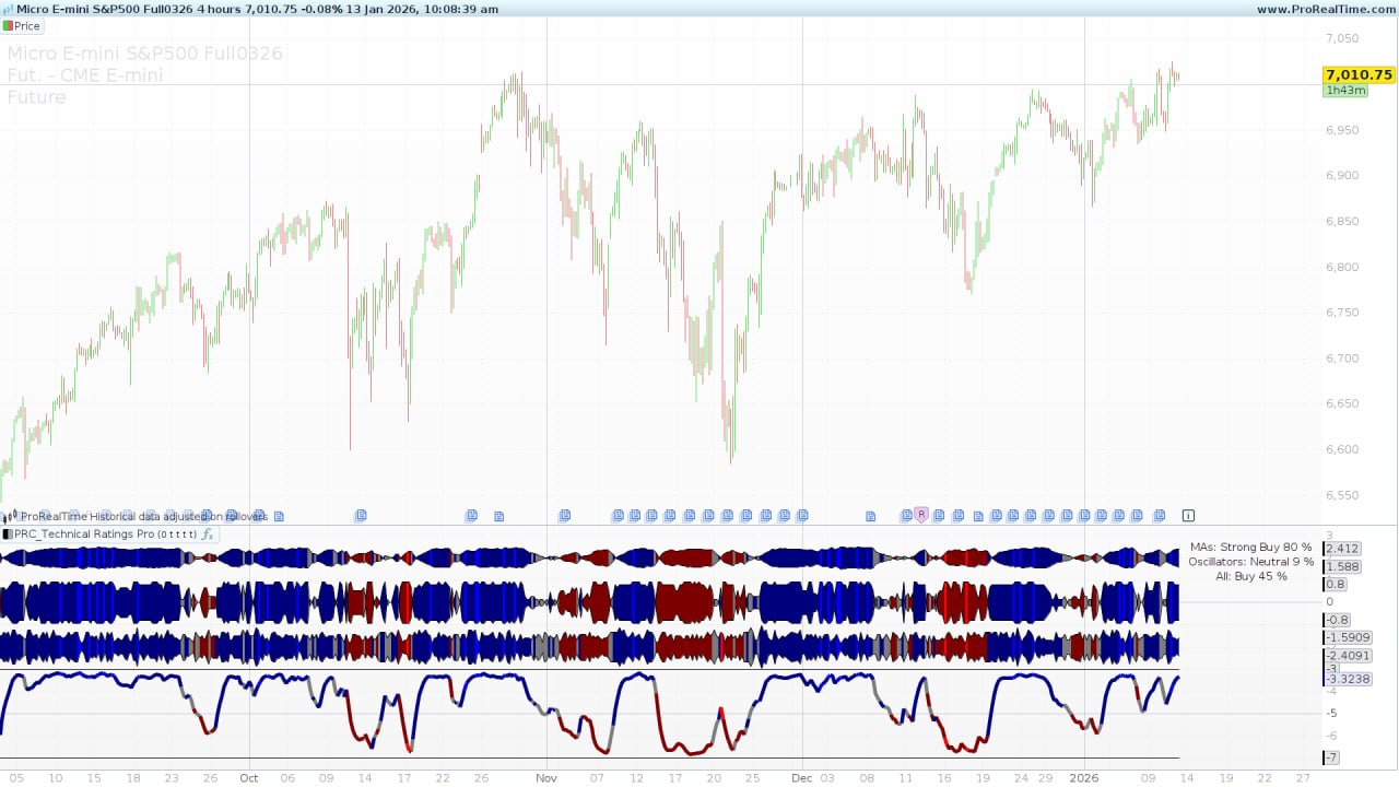 The Technical Ratings Pro is a high-level analytical tool designed to provide this consensus automatically. It aggregates 27 different technical conditions into a single, easy-to-read interface, giving you a real-time “score” of the market bias.