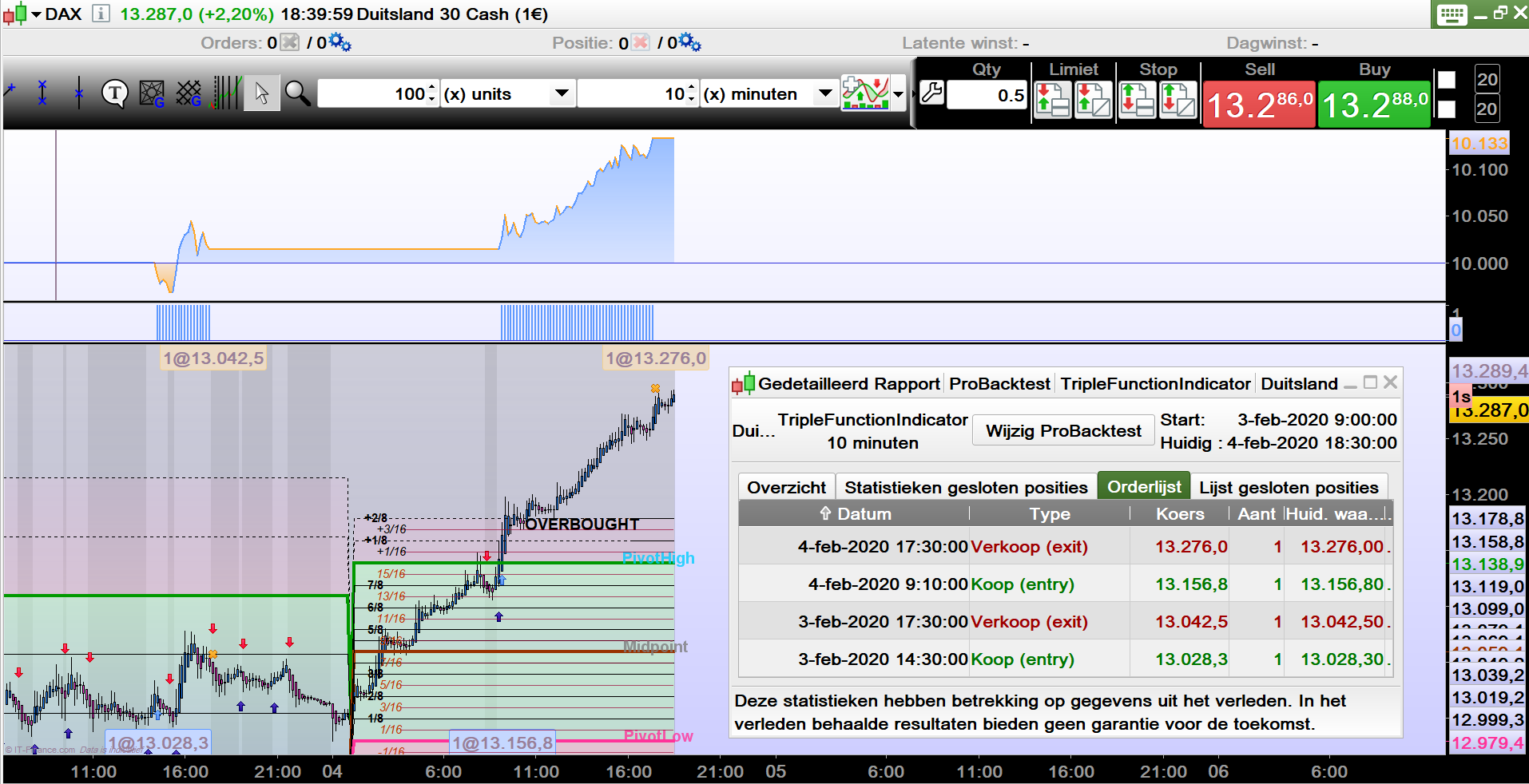 TripleFunctionIndicator (TFI) is meant to be a daytrading system that give good results on a 10 minutes graphic. Especially its a combination of three 3 Indicators namely the SMI The CCI and the RSI indicator. As you can see on the graphic,, even on an overbought situation, given by DemarkIndicator it do work. The classic limits for each indicator are repected.