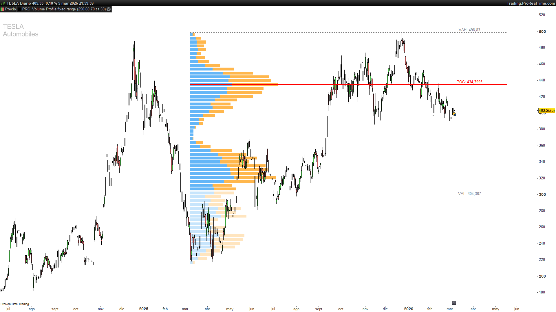 Volume in each channel is split into bullish volume (bars where close > open, shown in blue) and bearish volume (shown in orange), at both full and reduced opacity depending on whether the channel is inside or outside the Value Area.